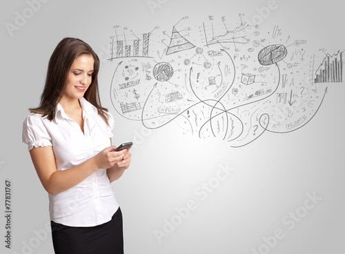 Business girl presenting hand drawn sketch graphs and charts