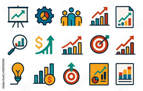 Business growth and analytics icons in flat design featuring charts and graphs