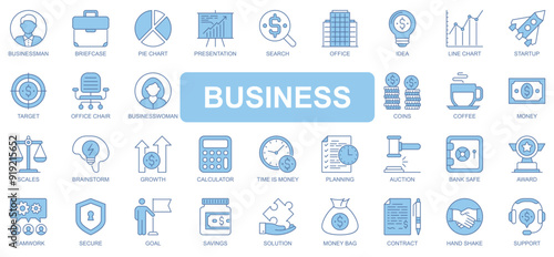 Business icons set in duotone outline stroke design for web. Pack pictograms of businessman, briefcase, pie chart, presentation, search, office, idea, startup, target, other. Vector illustration.