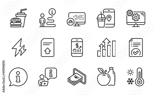 Business icons set. Included icon as Analysis graph, Hamburger, Report statistics signs. Approved document, Apple, Electricity symbols. Cash, Weather thermometer, Upload file. Settings. Vector