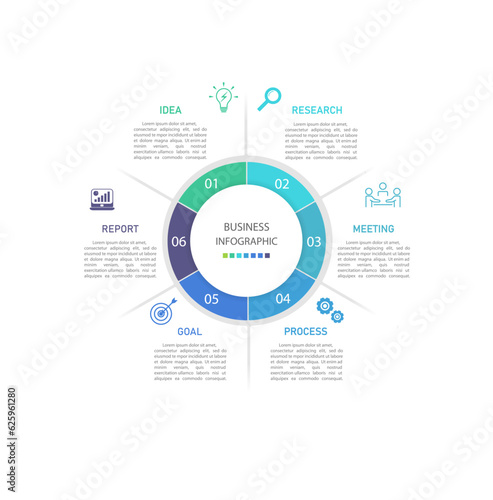 Business infographics line process with template with icons and 6 options or steps.infographics of business,idea,research,meeting,process,goal,report.for infographics design template