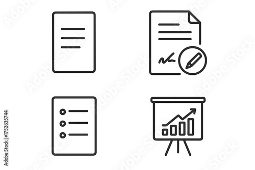 Business line icon set. Document, contract, signature, checklist, and presentation with growth chart. Vector icons with editable stroke for infographics and reports.