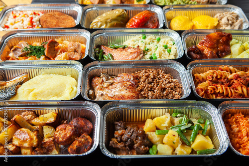 Business lunch in eco plastic container ready for delivery.Top view. Office Lunch boxes with food ready to go. Food takes away. Catering, brakfast