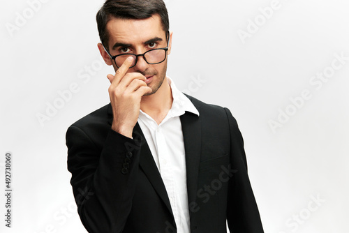business man in a black suit and adjusts his glasses on his face self-confidence light background copy-space