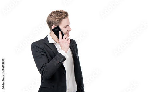 Business man in formalwear talk on cellphone isolated on white copy space, mobile talking