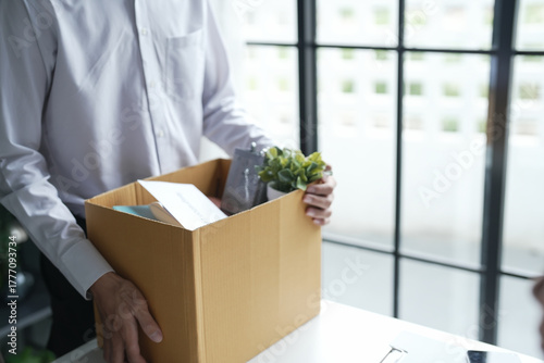 Business man sending resignation letter and packing Stuff Resign Depress or carrying business cardboard box Change of job or fired from company resign.
