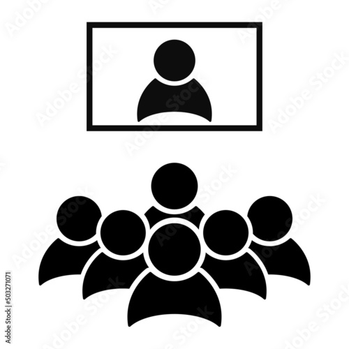 Business meeting, discussion. Public Speaker on the screen monitor. Teamwork activity. White Collar Worker. Vector illustration