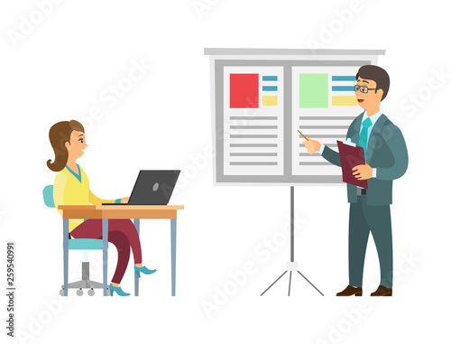 Business meeting of employee and employer vector. Whiteboard with data and text, explanation of plan on board. Woman sitting by laptop listening to man