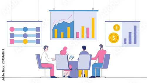Business meeting with charts and graphs presentation showing financial data and project management timelines