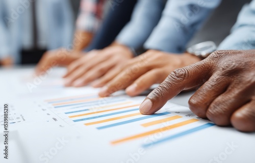 Business meeting with diverse professionals analyzing colorful data charts and graphs