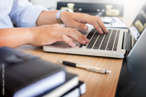 business men working on wooden desk(table) with notebook computer paper, pencil and hand in office, financial concept.