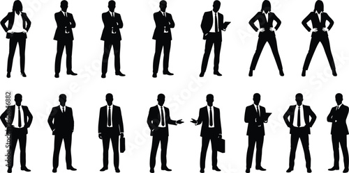 Business people silhouette vector set, professional men and women in corporate poses, leadership and office style characters, black human figures isolated on white background