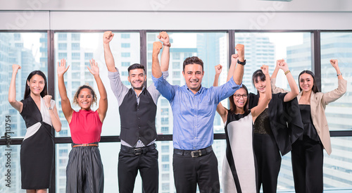 business people stand with confidence in modern office look to camera,team business raise hand