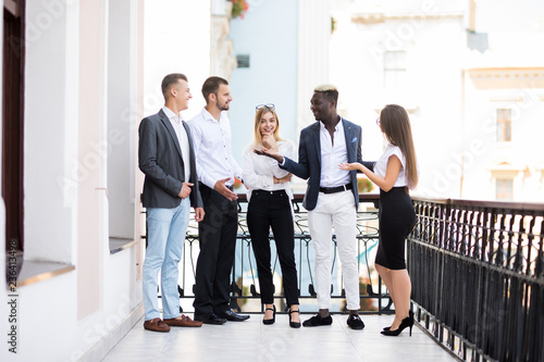 Business people standing and brainstorming in workshop meeting room on coffee brake