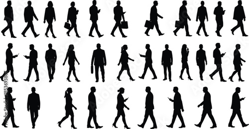 Business people walking, professional silhouettes in motion, office workers with phones and briefcases, vector illustration for corporate, business design