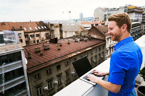 Business person using laptop on rooftop