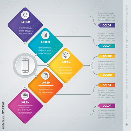 Business presentation concept with 5 options. Infographic or timeline of technology or education process. Web Template of a info chart or diagram. Part of the report with icons set.