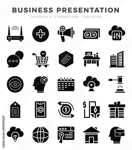Business Presentation elements. Glyph web icon set. Simple vector illustration.