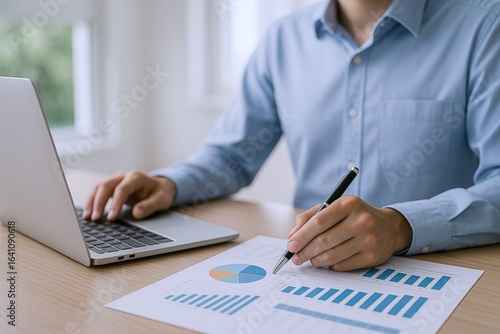 Business Professional Analyzing Financial Data and Charts on a Laptop in Bright Workspace Environment