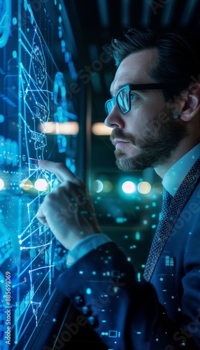 Business Professional Explaining Strategy with 3D Models on Interactive Digital Screen