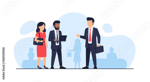 Business professionals collaborate, discuss strategy, and network in a corporate setting. Ideal for themes of teamwork, communication, and modern enterprise.