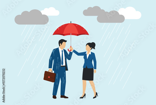Business Professionals Sharing Umbrella Front View Illustration, Rainy Day Concept, Office Attire, Corporate Collaboration, Teamwork, Support, Weather, Protection