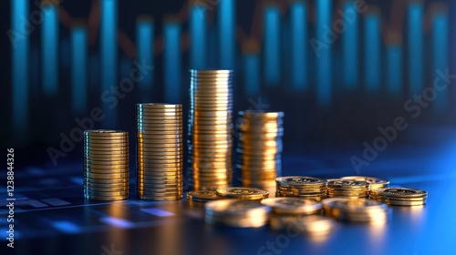 Business profits, rising bar graph with golden coins, 3D illustration.