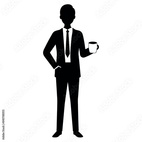 business standing with professional outfit, holding a cup of tea with cheers mode, vector silhouette