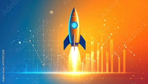 business startup concept background, rocket launch illustration, business growth chart, futuristic tech design, gradient blue and orange tones