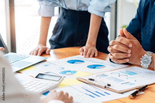 Business team meeting to conference, collaboration discussing working analyzing with financial data and marketing business strategy project, presentation and brainstorming to making profit of company