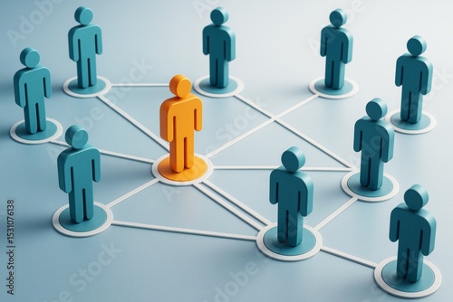 Business team network with central leadership figure in a creative concept on light blue background, symbolizing communication and teamwork.