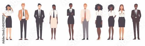 Business team of diverse businesspeople standing in a row flat cartoon character designs Generative AI
