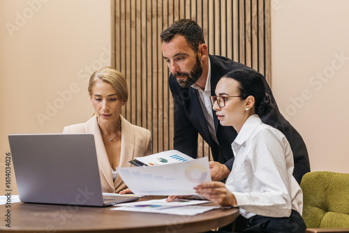 Business team of three professionals, two women and one man, collaborating at a modern office table, analyzing data on a laptop and discussing project strategies with printed reports