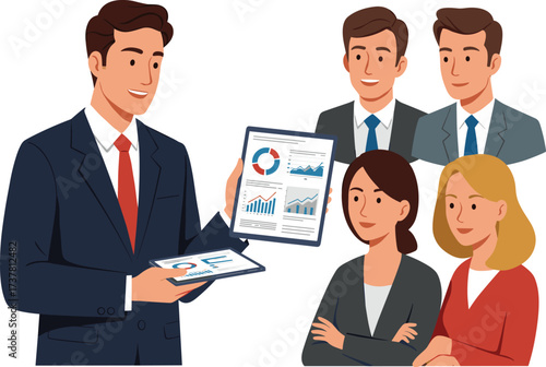 Business team presentation with professional man showing financial charts and graphs during corporate meeting and discussion
