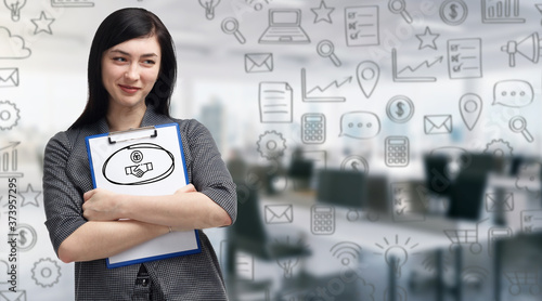 Business, technology, internet and network concept. Young businessman thinks over the steps for successful growth: