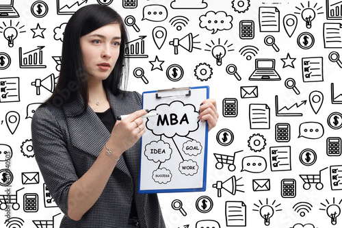 Business, technology, internet and network concept. Young businessman thinks over the steps for successful growth: MBA