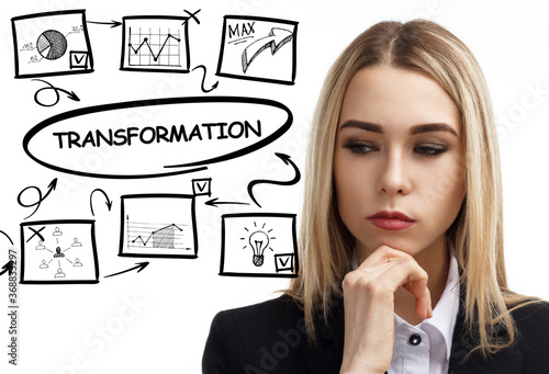Business, technology, internet and network concept. Young businessman thinks over the steps for successful growth: Transformation