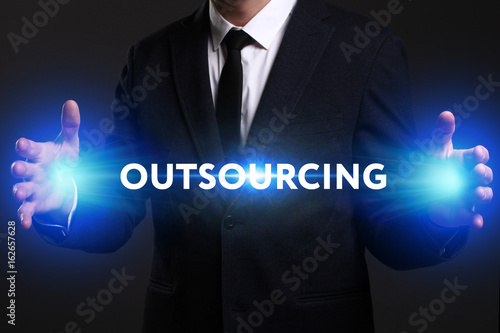 Business, Technology, Internet and network concept. Young businessman working on a virtual screen of the future and sees the inscription: Outsourcing