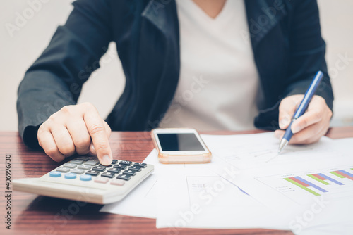 business woman hand holding pen use calculator and finger point on growth statistics chart and graph on paper work for analysis and calculate budget financial accounting.