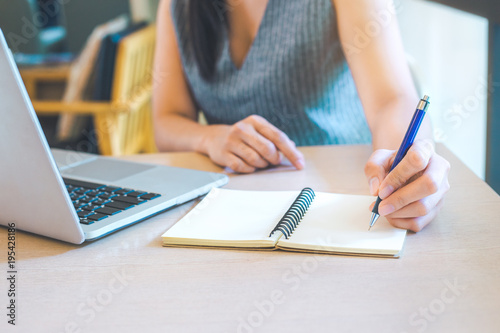 Business woman hand is writing on notepad with pen in office.