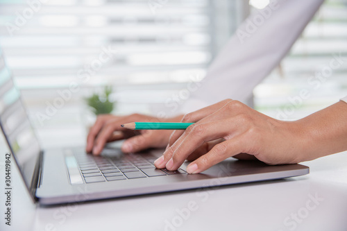 Business Woman or accountant.The laptop is on the table. Rest their hands on a laptop with a pencil Business planning Financial accountants work and calculate annual financial statements..