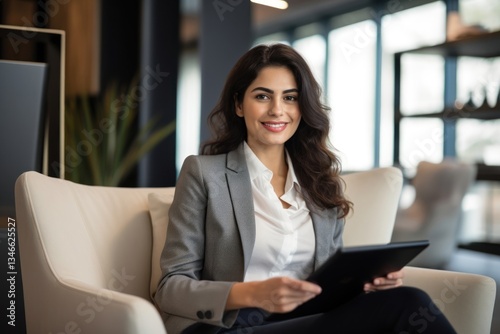 Business woman sitting and holding tablet smiling adult entrepreneur.