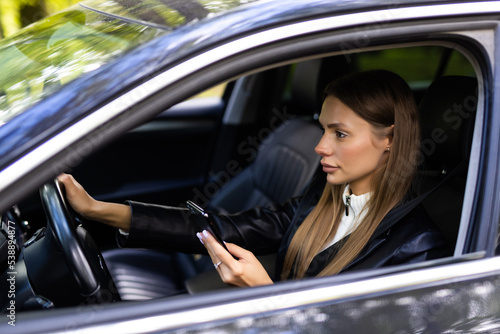 Business woman sitting in car and using her smartphone.