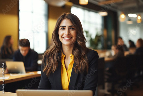 Business Woman Smiling in Yellow Top and Black coat at Office with Office Background