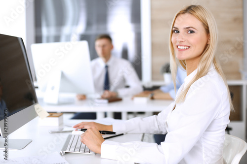 Business woman using computer at workplace in modern office. Secretary or female lawyer smiling and looks happy. Working for pleasure and success