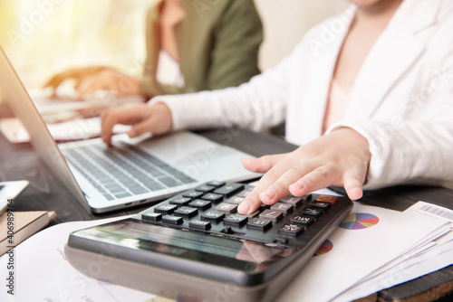 Business woman working teamwork process, Business team using a calculator to calculate the numbers of statistic business profits growth rate on documents graph data, his desk in a office.