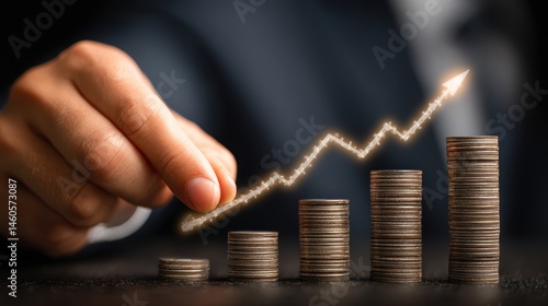Businessman analyzing arrow graph, pointing to corporate future growth plan, success concept.