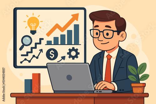 Businessman analyzing data and planning growth strategy on laptop. Vector illustration with chart, ideas, graph, dollar symbol, magnifying glass, teamwork, office, financial success concept