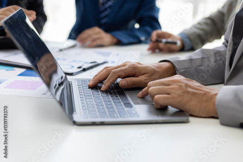 Businessman analyzing financial chart and report using laptop computer. Business people working together at office desk analyzing financial charts and reports using laptop.