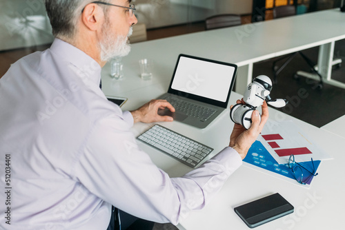 Businessman analyzing toy robot sitting at desk in office